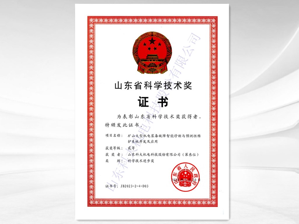 12月,公司“矿山大型机电装备故障智能诊断与预测性维护系统开发及应用”项目, 获批2023年度山东省科学技术进步二等奖;